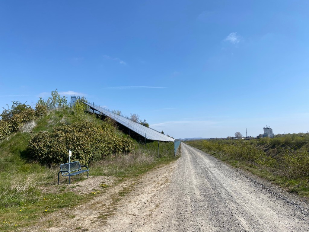 Die angrenzende Bahnstrecke und Autobahn laden zu einem vergnüglichen Spaziergang ein. Natürlich nicht auf ihnen, sondern zwischen ihnen. Ein kleiner Pfad, der von einer unsagbar langen Solarzellenstrecke gesäumt wird, verstärkt den Eindruck der Trostlosigkeit um ein Vielfaches und erscheint uns vor allem für Menschen, die nicht zu viel Natur in ihr Leben lassen wollen, interessant. In der nicht allzu weiten Ferne fällt der Blick auf den Tagebau Hambach, der vor allem mit seinen unterschiedlichen Braun- und Grautönen eine Beleidigung für das Auge ist. Die Bank, die an dieser Stelle zum Verweilen einlädt, erscheint wie das Machwerk eines menschenverachtenden Zynikers.