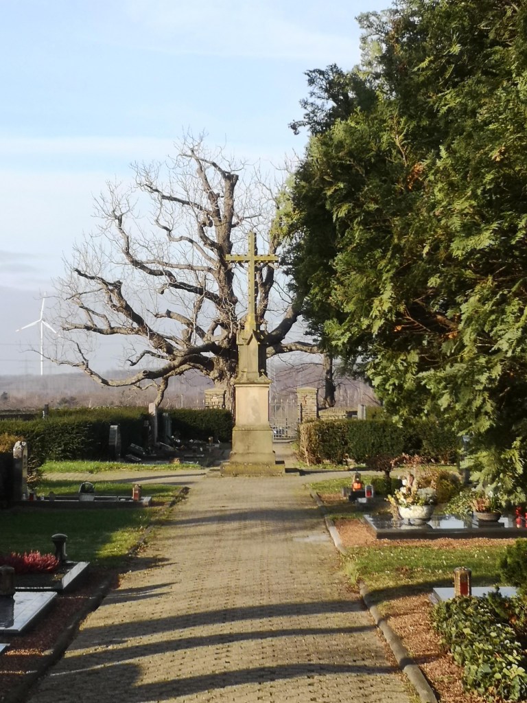 Wir fahren mit dem Auto nach Oberaußem, von dem Dan weiß, dass es sich dabei um einen der wenigen Orte des Rhein-Erft-Kreises handelt, die Eingang in die Weltliteratur gefunden haben. Hier steht nämlich die sagenumwobene „Grass-Kastanie“. Dan glaubt sich zu erinnern, dass diese auf dem Friedhof in Oberaußem zu finden ist und so steuert er diesen zielsicher an. Nach dreißigminütiger Suche und unter Zuhilfenahme von Google (was bei einem Netzempfang von Edge-Qualität viel von einem Glücksspiel hat) stellen wir fest, dass Oberaußem zwei Friedhöfe hat. Wir stehen auf dem sogenannten „Waldfriedhof“, was wir beide für einen Euphemismus halten. Die Grass-Kastanie befindet sich hingegen auf dem alten Friedhof, den wir sofort ansteuern. Auf dem Weg dorthin stellen wir fest, dass der Name „Oberaußem“ wahrscheinlich abgeleitet ist von der fast schon alpinen Lage des Ortes. Hier kann man ein paar Höhenmeter machen und nur Dank unserer mittlerweile hervorragenden Kondition schaffen wir es ohne längere Pause zum Friedhof.