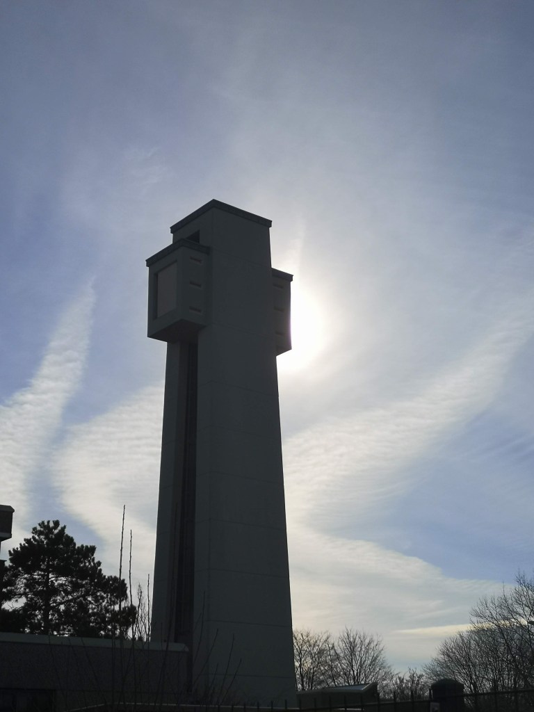 Weiter geht es. Auf der Oberaußemer Straße angekommen fällt unser Blick auf den vielleicht hässlichsten Kirchturm, den wir jemals gesehen haben. Irgendwie erweckt das gesamte Kirchengebäude den Eindruck, als wolle man das nahe Kraftwerk in allem übertrumpfen. Architektonisch erinnert uns das alles mehr an eine Lagerhalle. Wie ein Mahnmal der Trostlosigkeit ragt dieser Beton-Prügel in den Himmel und verdeckt die Sonne. Naja, Hauptsache den Leuten hier gefällt es.