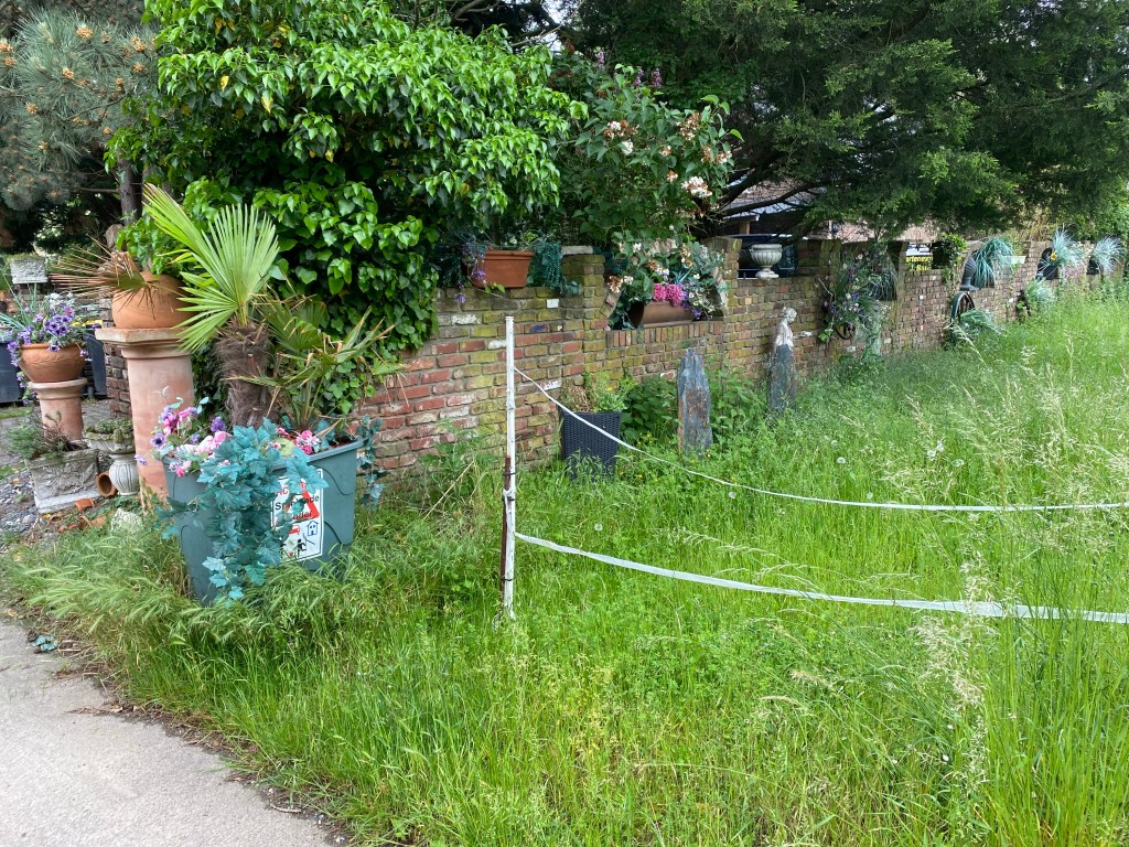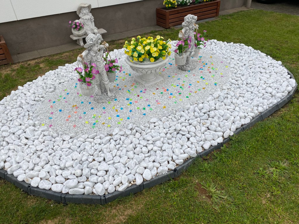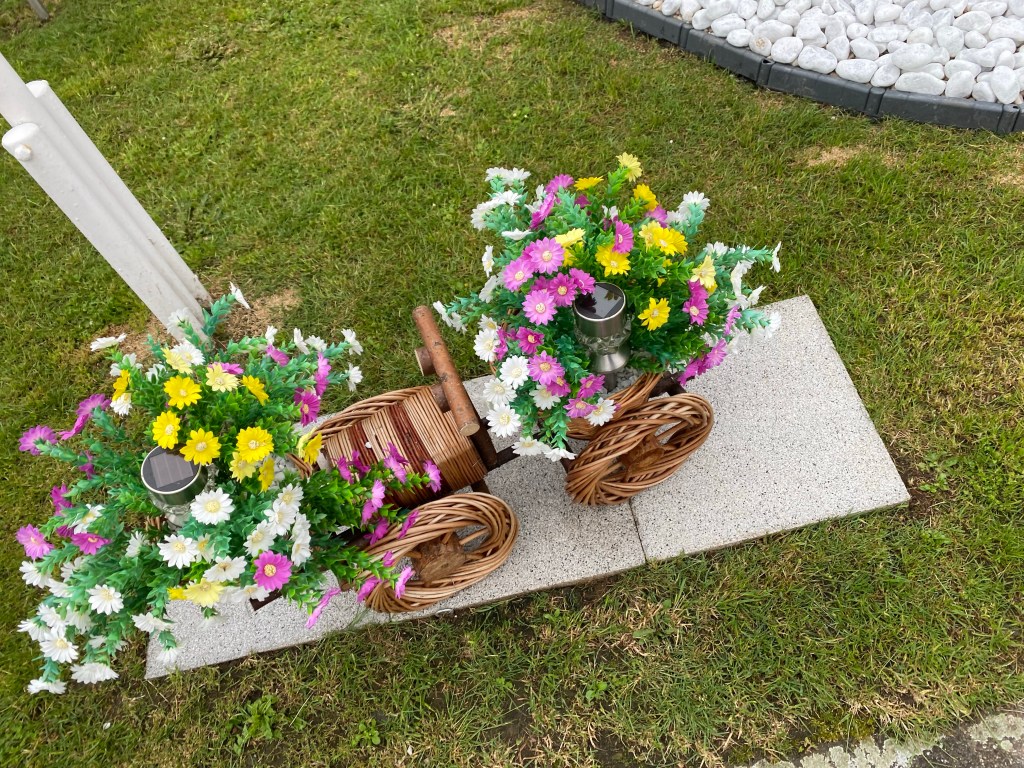 Waren es in der Friedensstraße noch die kunstvoll gepressten Eulen aus Hartwachs, so sind es nun im Viertel „Mohnweg/Margeritenweg/Fliederweg“ nicht minder kunstvoll arrangierte Kunstblumenbouquets, die einige Vorgärten schmücken und uns den Atem rauben.
