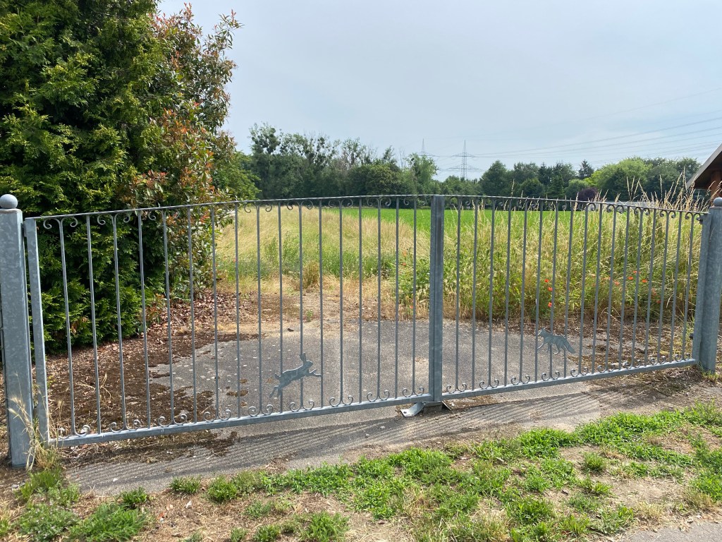 Am Ortseingang, Glescher Str. angekommen sehen wir einmal mehr, wie wichtig Zäune und Tore sind! Auch wenn es keine Wege dahinter gibt. Erstmal ein Tor bauen, der Rest kommt später. Muss ja alles seine Ordnung haben.
