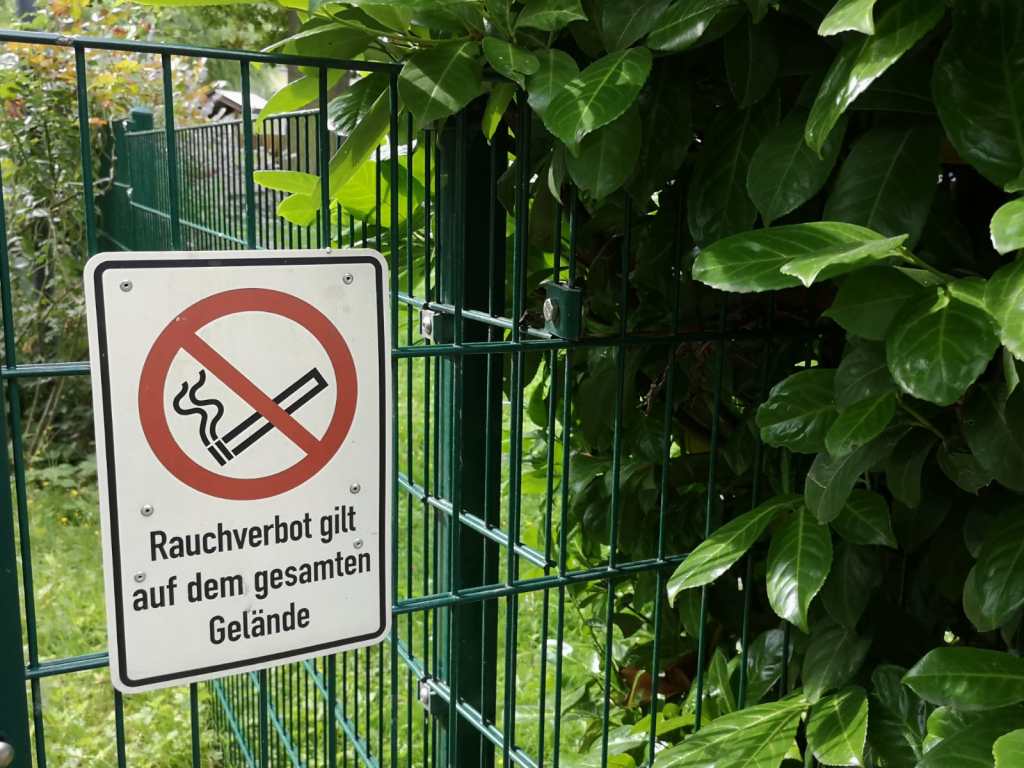 Anscheinend hat sich in der Römerstraße seit dem Durchmarsch der namensgebenden Legionen der Straßenbelag nicht geändert. Die Hausfassaden wurden aber durchaus der ein oder anderen Modernisierung unterzogen. Handelte es sich um Haarschnitte, wären die Worte „flippig“ und „verspielt“ wahrscheinlich die passenden. Von hier kommen wir direkt auf die Paul-R.-Kraemer-Allee und die geneigte Leserschaft wird vielleicht hier schon feststellen, dass der Name „Kraemer“ und Buschbell fest miteinander verbunden sind. Warum man diesen besseren Feldweg, der unter der Autobahn herführt aber „Allee“ genannt hat, erschließt sich uns nicht. Kurz vor der Autobahnbrücke entdecken wir ein geöffnetes Tor, hinter dem sich ein von Laternen gesäumter Pfad befindet. Wir beschließen natürlich, diesem zu folgen, gelangen aber nur zu einer Art Gartenhaus und dem Hintereingang eines Kindergartens, bei dem anscheinend viel Wert auf eine rauchfreie Umgebung gelegt wird.