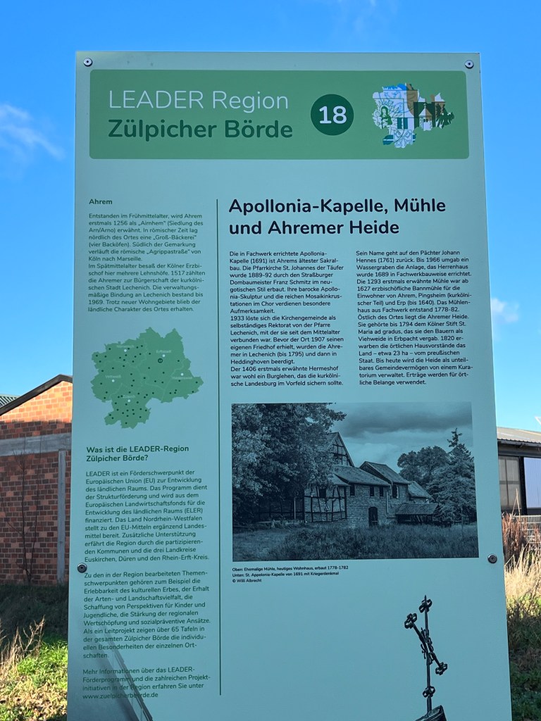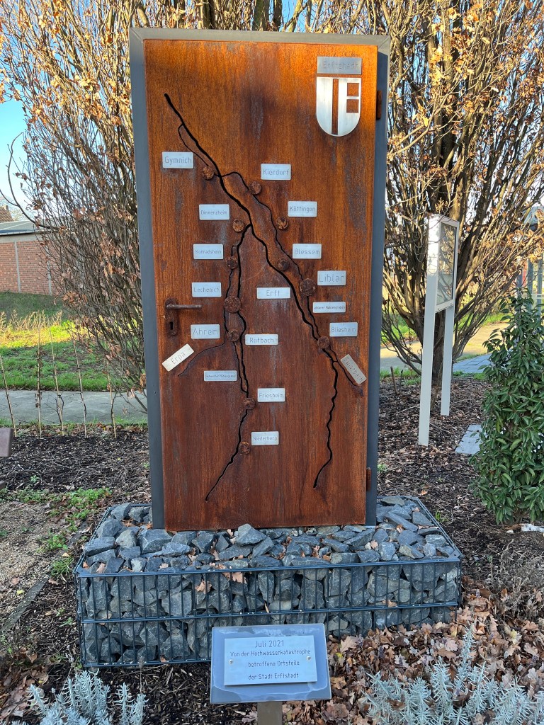 Die Flutkatastrophe des Sommers 2021 hat auch in Ahrem ihre Spuren hinterlassen. Wie in so vielen Erftstädter Stadtteilen schwollen hier die Bäche an, wie sonst nur die Halsschlagader Olaf Scholz‘, wenn befreundete Länder nach Panzerlieferungen fragen. Wenngleich die Auswirkungen hier deutlich geringer ausfielen als beispielsweise in Erftstadt-Blessem, so erinnert doch auch hier eine Stele an die schwierige Zeit. Kleiner Pro-Tipp: Die Tür lässt sich nicht öffnen…