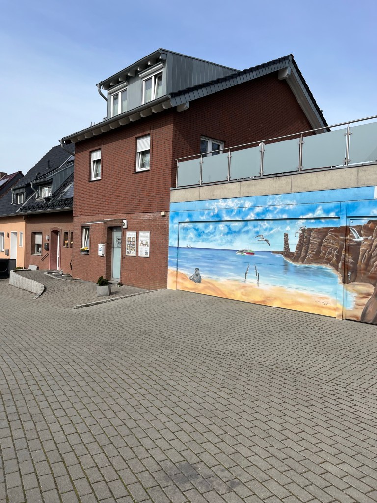Die aus heutiger Sicht vielen städtebaulichen Fehlentscheidungen der 1960er und 1970er Jahre versuchen die Stadtväter und -Mütter mittlerweile durch herrliche Kunstinstallationen im öffentlichen Raum auszugleichen. Man ist mitunter verwundert was so alles mit öffentlichen Mitteln gefördert werden kann. Im gesamten Ort findet man diese halbfertigen Galgenanlagen für Kleinwüchsige. Die sind schön bunt. Immerhin.