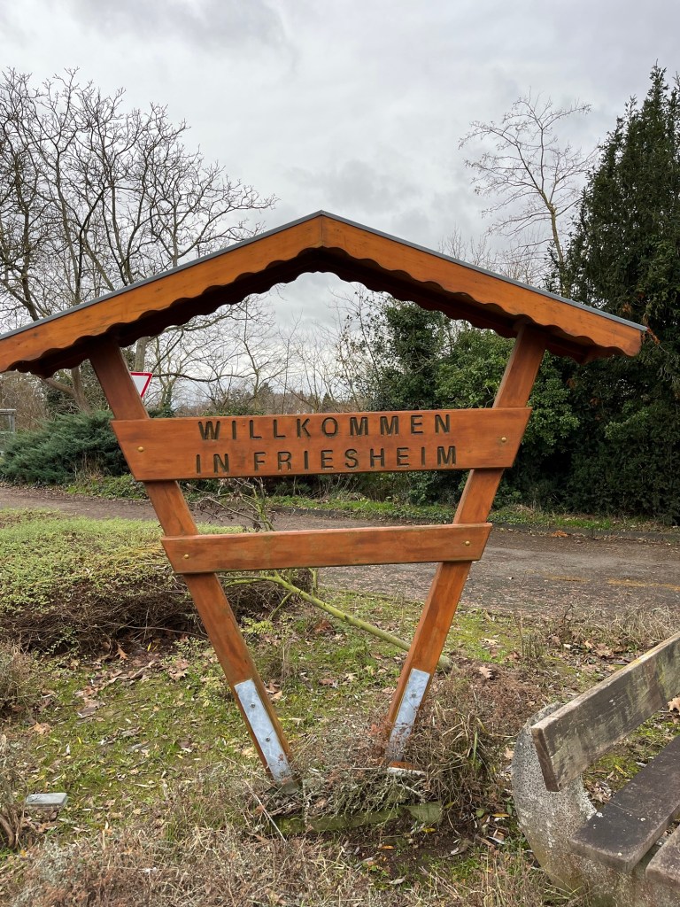 So ein herrlich grauer, wolkenverhangener und tröpfchenregenfeuchter Wintertag bietet die perfekte Kulisse für einen ausgiebigen Ausflug in den südöstlichen Rhein-Erft-Kreis, genauer gesagt nach Friesheim. Ein Ort, den man gerne vergisst, wenn man die grünen Auen Ahrems genossen und die blühenden Böden Bliesheims durchstriffen hat. Dabei bietet der Erftstädter Ortsteil einiges, was man anderswo auch nicht finden möchte. Was man wirklich schnell findet, das sind Parkplätze und so stellen wir unseren Reisebus der guten Laune direkt im Ortsinneren am Friesheimer Brunnen (außer Betrieb) ab und genießen einen besonnenen Blick auf den Rotbach – die örtliche Fischwasserversorgung, die später in Dirmerzheim in die Erft mündet. Jener Fluss, der kurz darauf bei Neuss im Rhein sein Ende findet, welcher wiederum in die Nordsee und damit bald schon in den Atlantik aufgeht. Friesheim liegt also quasi am Meer.