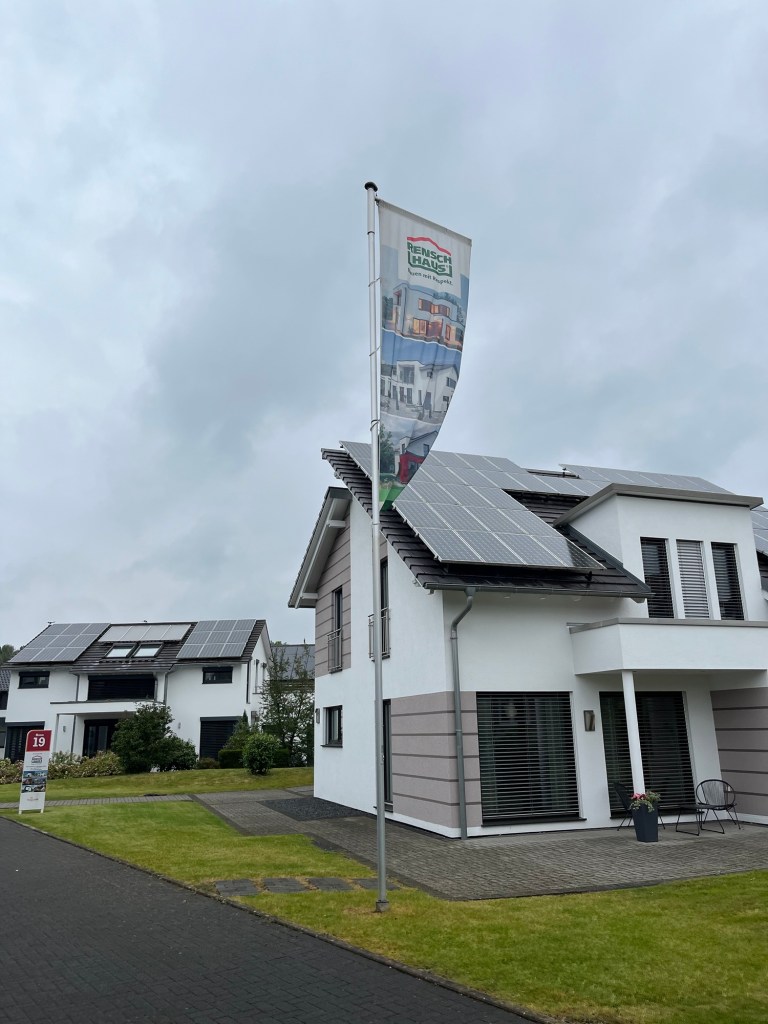 Was Brühl sein Phantasialand, das ist Frechen seine Fertighauswelt. Ein quasi überdimensionierter, begehbarer Katalog aus der Welt schnell errichteter Wohnmöglichkeiten mit Pfiff. Wir schlendern entspannt durch diese betongewordenen Träume designierter Hyper-Verschuldeter und bewundern besonders die raffinierten Außenbereiche der Häuser, die oft mit geschmacklich-waghalsigen Wasserspielen und ertrunkenen Fröschen aufwarten. Wenn man übrigens, und das dürfte die kostenbewussten Leserinnen und Leser dieses Blogs interessieren, ein Haus kauft, bekommt man den Eintrittspreis von drei Euro erstattet. Das betrachten wir als fair und kundenfreundlich.
