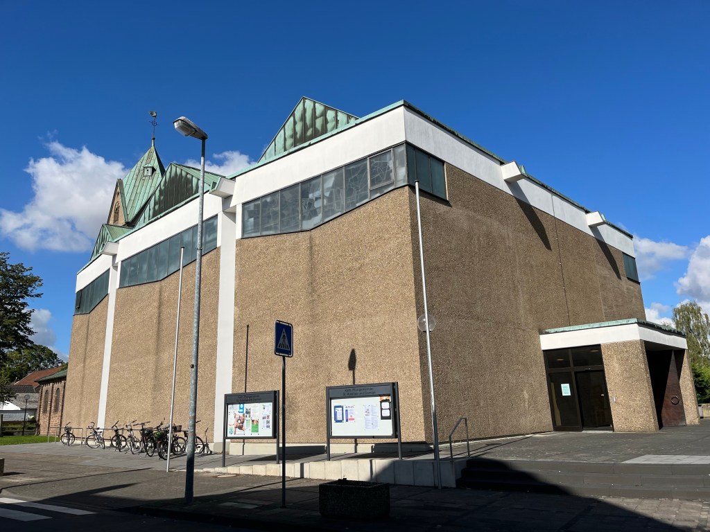 Über die Krankenhausstraße gelangen wir zur Kirche St. Severin und biegen von dort in die Severinusstraße ein. 38 Schritte später stehen wir im Deutschordenweg und befürchten erst, dass jede Sekunde Menschen in Harnischen oder zumindest hoch zu Ross unsere Wege kreuzen, aber es bleibt relativ unspektakulär. Die Häuser, die hier stehen, erinnern an eine Mischung aus Schrebergarten und „Roompot Park“. Wer eine heimliche Liebe für Flachdacharchitektur hegt oder die Vielfalt der Vorgartengestaltung genießen will, wird hier fündig. Am Ende des Weges treffen wir dann doch auf Ritter, zumindest auf Menschen, die Werte wie Heimat und Tradition pflegen. Die St. Hubertus Schützenbruderschaft steht mit einer kleinen Abordnung vor einem Kriegerdenkmal und bläst zum Gedenken. Vor Rührung steigen uns die Tränen in die Augen und wir verharren kurz andächtig. Als die Gewehre angelegt werden, ziehen wir dann aber doch weiter und betreten den Burgpark, durch den sich herrlich flanieren lässt. Es gibt einen aufschlussreichen Baumlehrpfad und viele Stellen, die zum Verweilen einladen.